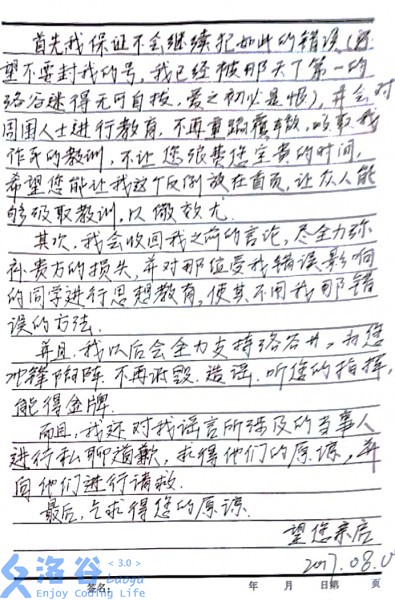 (洛谷已经向当事人间接声明过该道歉信将被公开,也并未得到拒绝,请不要以此滋事。)