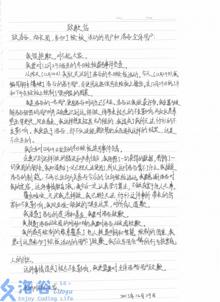 以下是当事人对所有受到影响用户的道歉信。由于当事人有自首情节、认错态度良好,洛谷决定不再追究并对其身份予以保密。