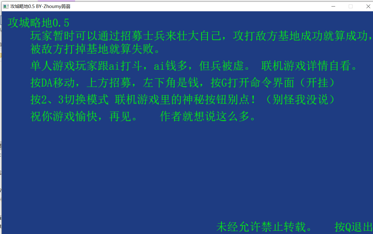 tip:如果不想要bgm删除lib文件里的bgm文件里的bgm2就可以了&&测试的时候先在开始界面把游戏速度设为10倍速,否则会画一点时间&&Zhoumy太菜了暂时只能做成这样了