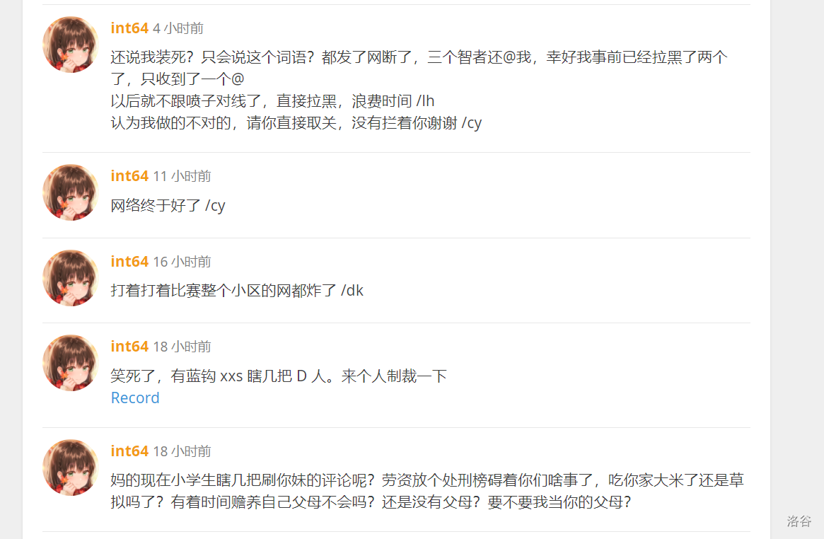 背景:我在那个小学生天下第一的团队里说int64 jc别人,并在他的处刑榜下说:"表示十分反感。"