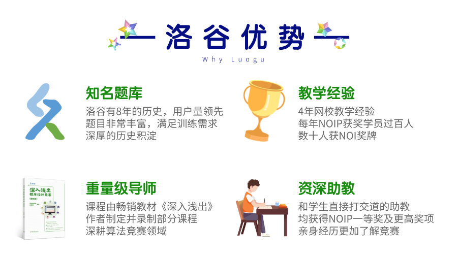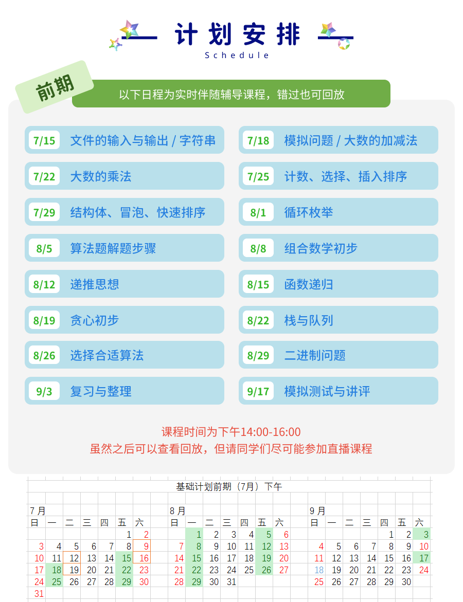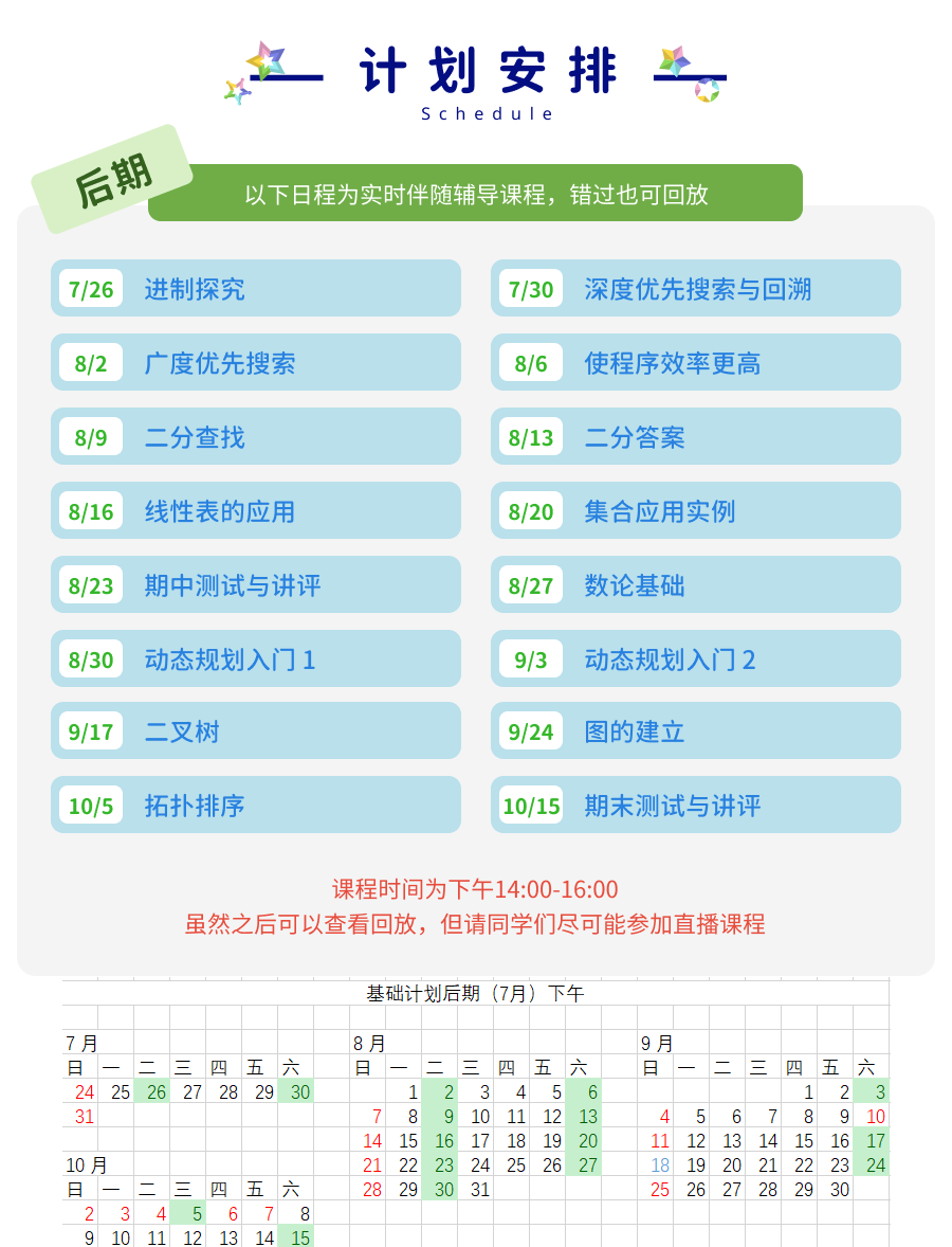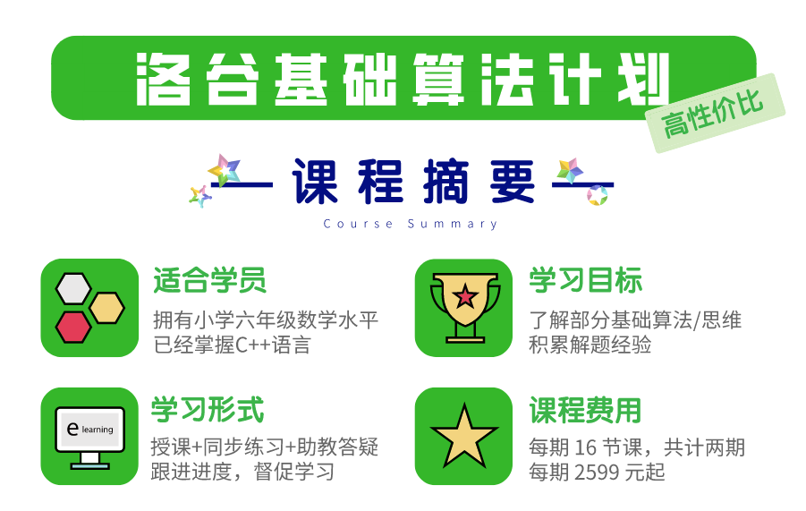 - 基础前期:已经掌握语言基础,内容包括模拟、枚举、排序、贪心、递推、二进制、线性表等。辅以针对性的练习,帮助学生搭建算法知识体系。【点击此处查看 >>>】