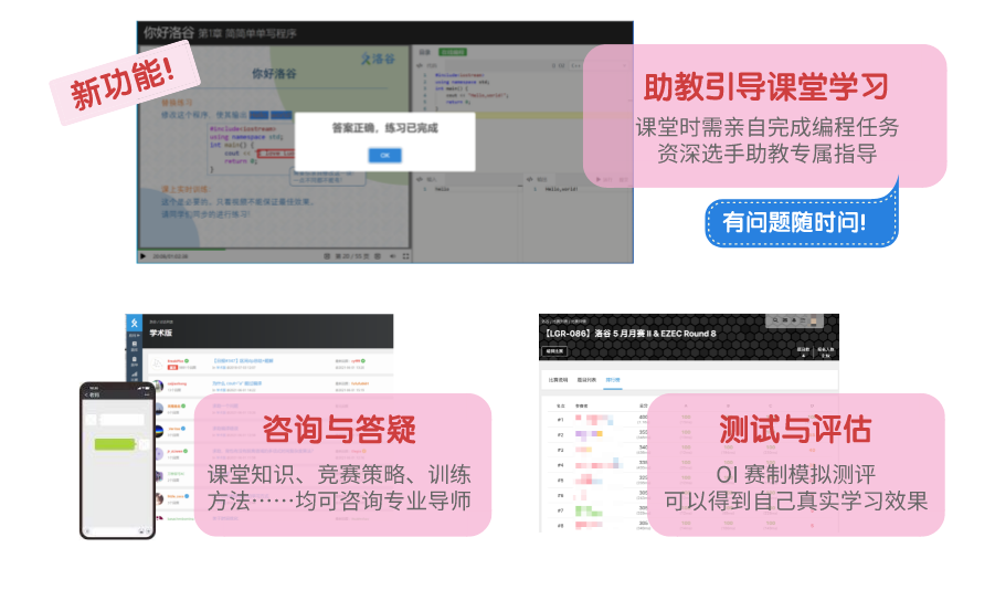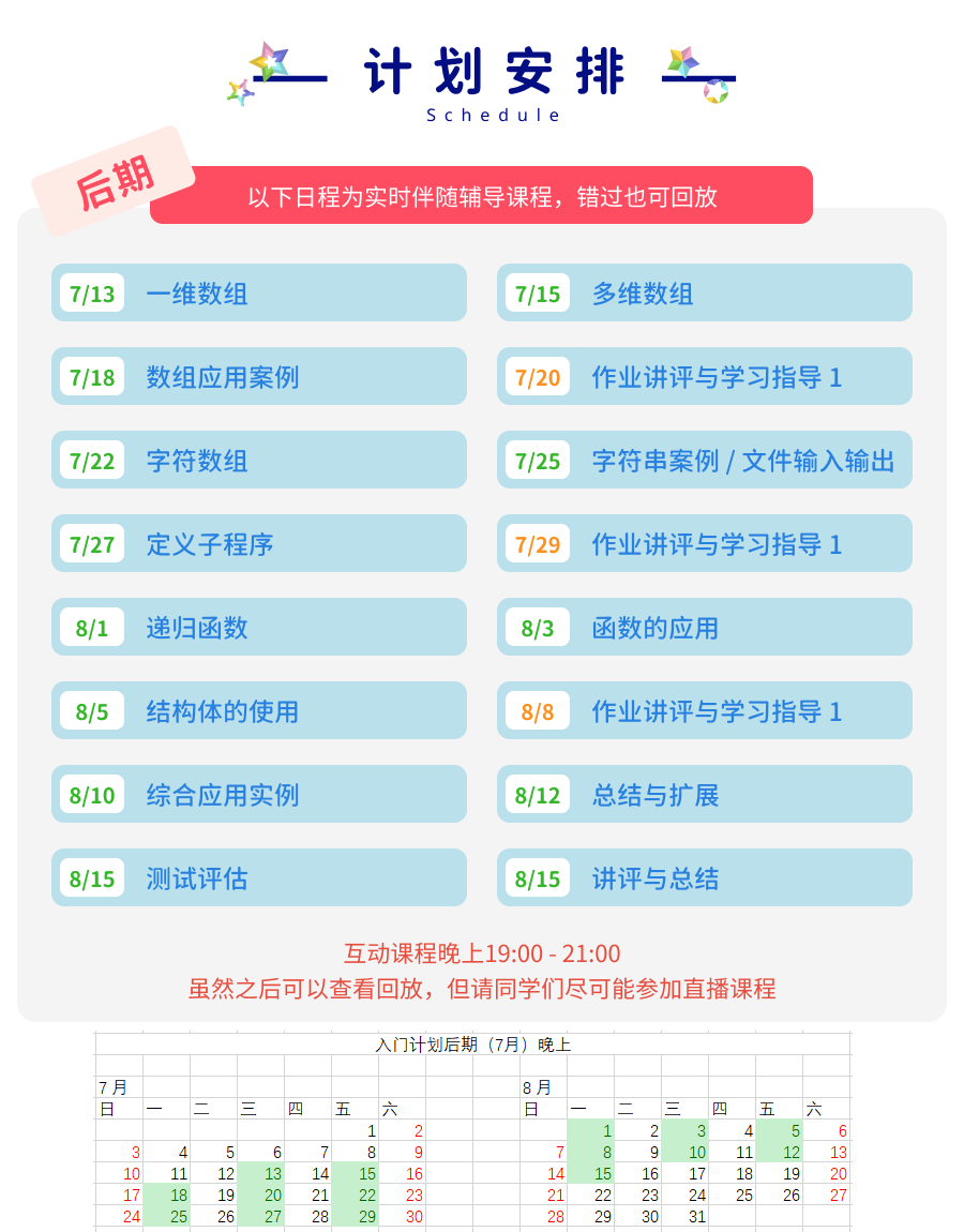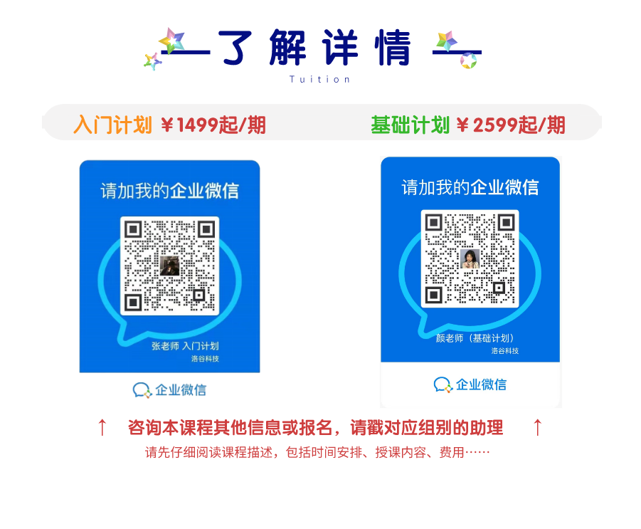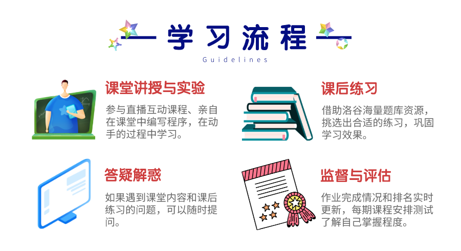 - 入门后期:适合已经学习完前期或者其他同类课程的学生。后期课程的内容包括数组、字符串、函数、结构体、文件输入输出等进阶 C++ 语言内容,同时包含测试与评估。初步了解算法竞赛思维,为之后学习算法打下坚实的基础。【点击此处查看 >>>】