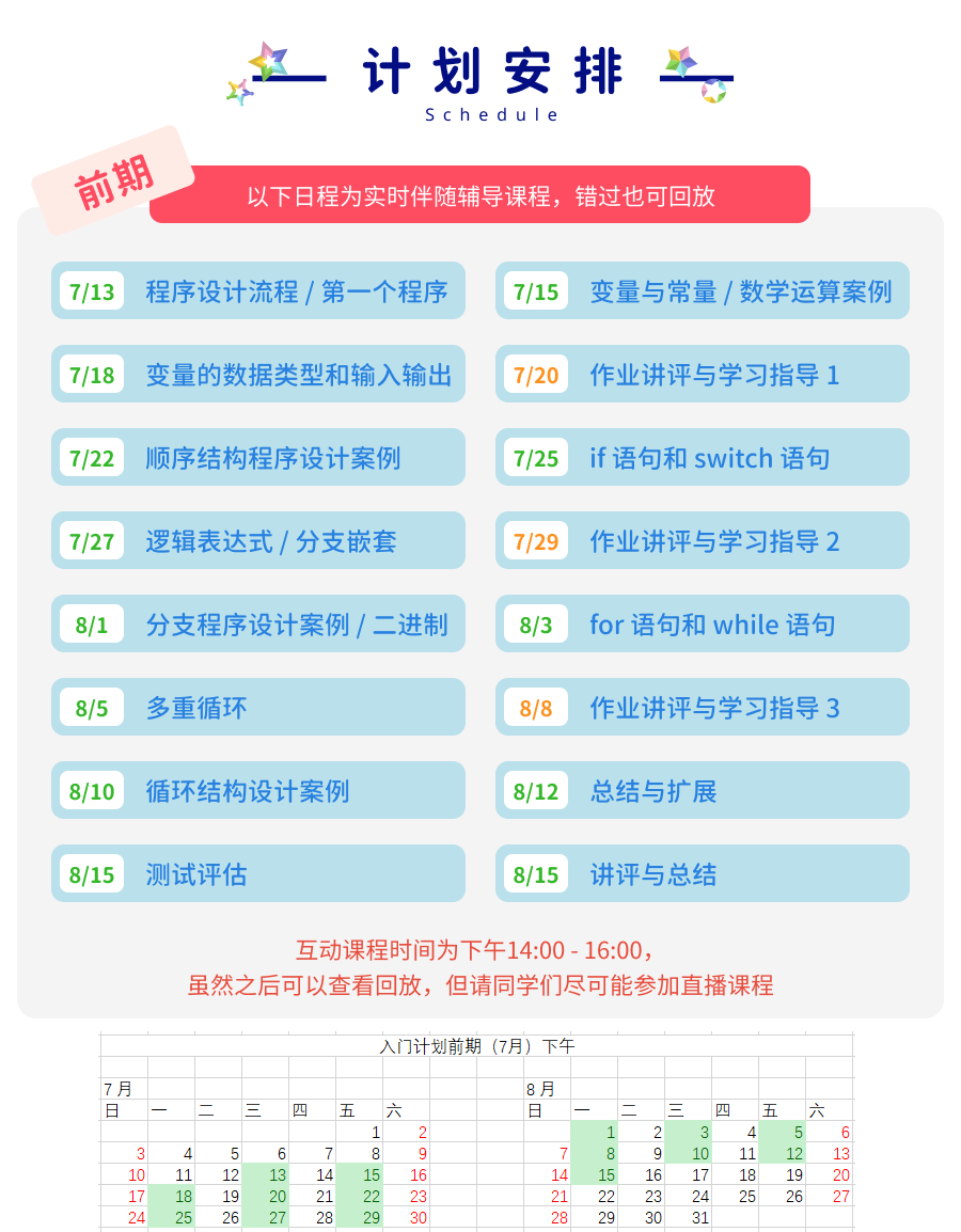 - 入门前期:从零基础开始学习,内容包括编程软件的安装和使用、顺序结构程序设计、变量与常量、分支结构程序设计、循环结构程序设计,同时包含测试与评估。【点击此处查看 >>>】