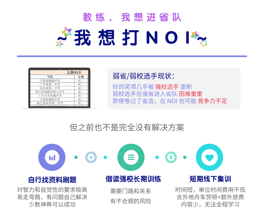 因为省选结果受个人努力和天赋、已经学习知识和练习的题目、应式策略和心态、省选测试题目的风格等多方面因素(排名分先后)的影响,学员应当权衡参与省选训练的风险,即该计划并不是学员可以顺利进入省队的保证。但学员应当持有信心和持续努力,达到理想的目标。