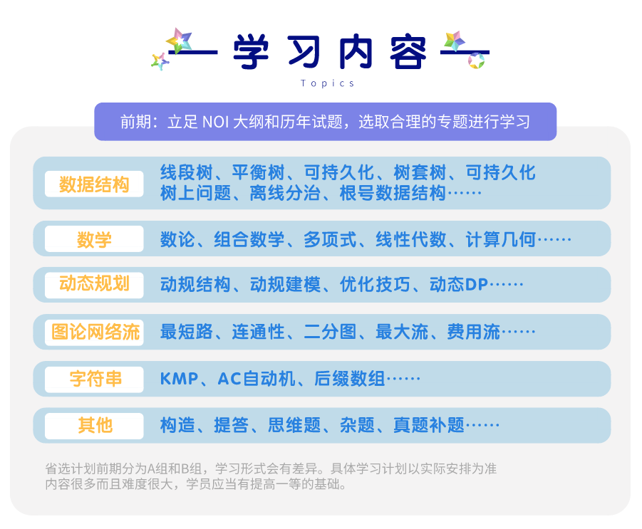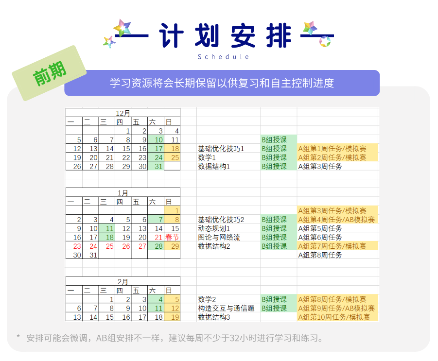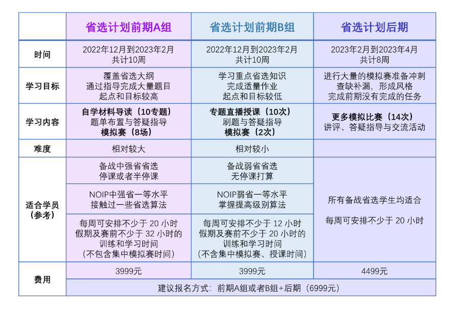注意:省选计划相比于最开始的计划延期一周,B 组 12 月 10 日开始,A 组 12 月 12 日开始。