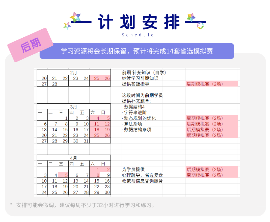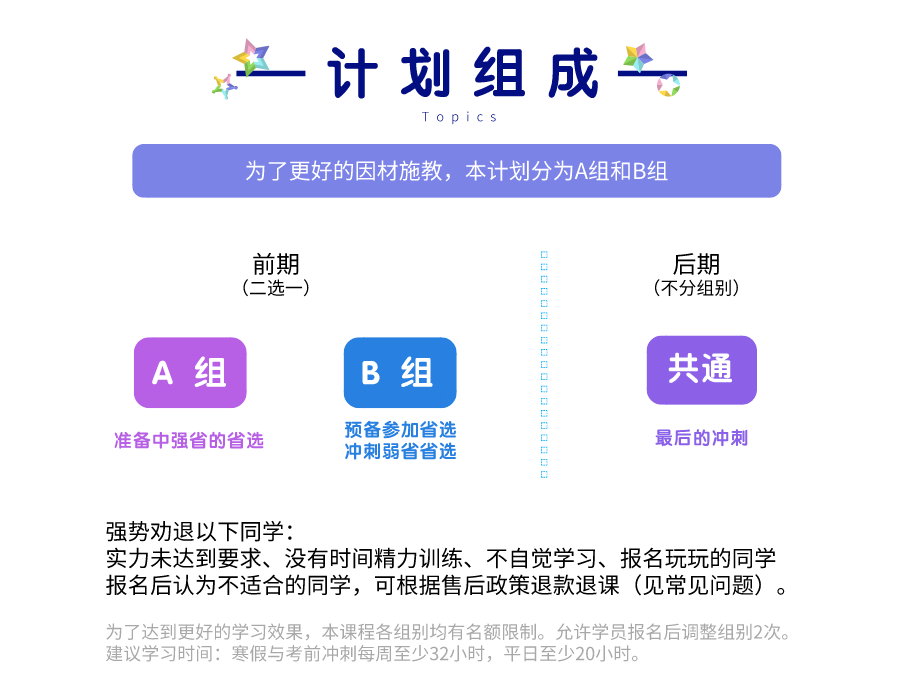 该计划是面向省选的 OI 选手的训练计划,难度大,耗时久、任务重。选手应当有获得 NOIP 提高组一等奖的实力后量力而行。为保证训练效果,建议前期花费每周不少于 24 小时、后期不少于 32 小时的训练和学习时间,并对学校文化课进行一些取舍,能够承担课业成绩波动的影响。