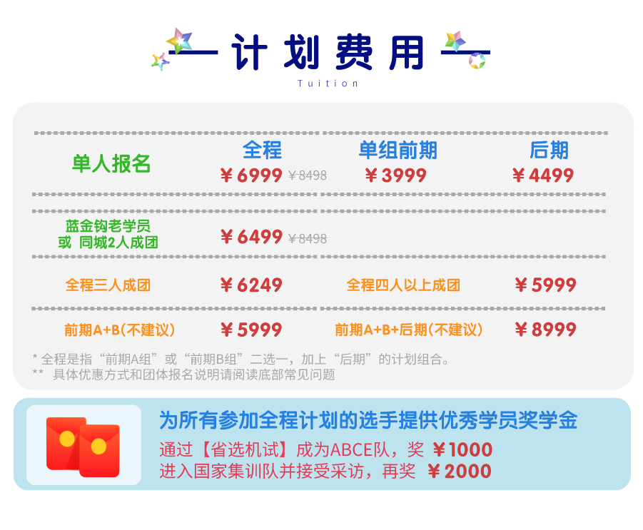 注: 如果先报名前期或者后期中的一个,之后再报名另外一个的,只需补上全程减去已经报名费用,加上 500 元即可(同时无法享受老学员优惠和团报优惠)。