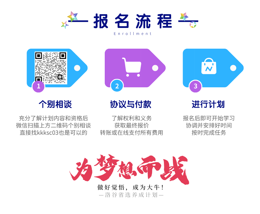 如果希望报名,或者有其他更多的问题,请使用微信扫描上方二维码,洛谷站长(群主)或者指定的助理进行人生相谈,不要直接报名或者付费。由于咨询的人数可能较多或群主较忙,可能会预约另外的时间。建议请先进行奖项认证。