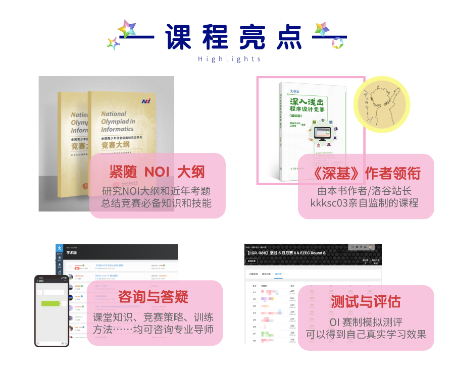 - 基础算法训练营 后期:已初步学完 CSP-J 基本算法和数据结构,包括递推、二分、搜索、队列和栈、基础 DP、基础图论等,需要巩固 CSP-J 内容的学生。https://class.luogu.com.cn/course/xly2023jc6