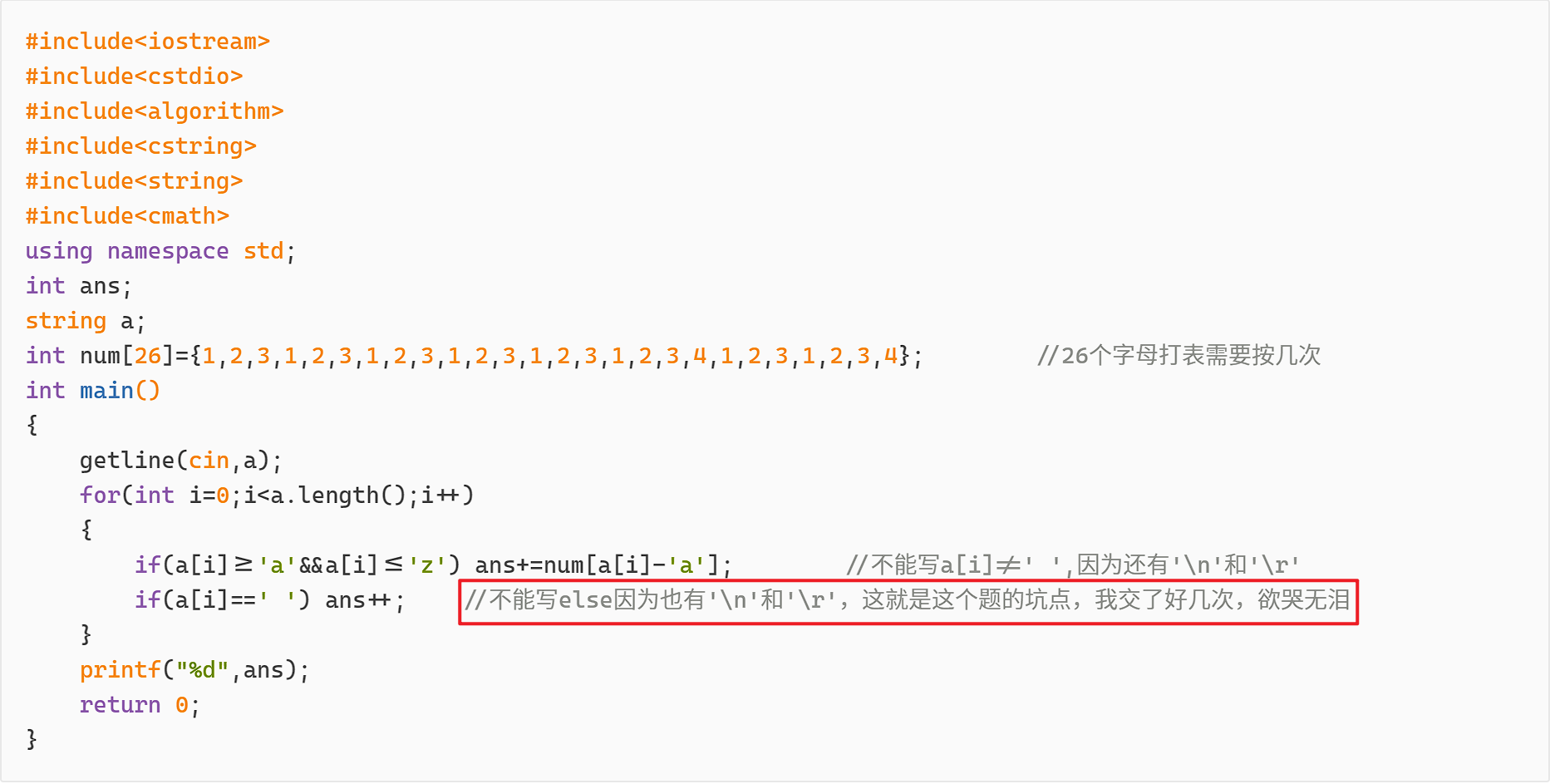 '\n'和'\r'的存在?我怎么记得getline(cin, s)是会自动丢弃换行符的啊……”然后我就不信邪,自己打了一个没有判断是不是空格的代码,和题解写得差不多,毕竟他思路和我一样,长这样