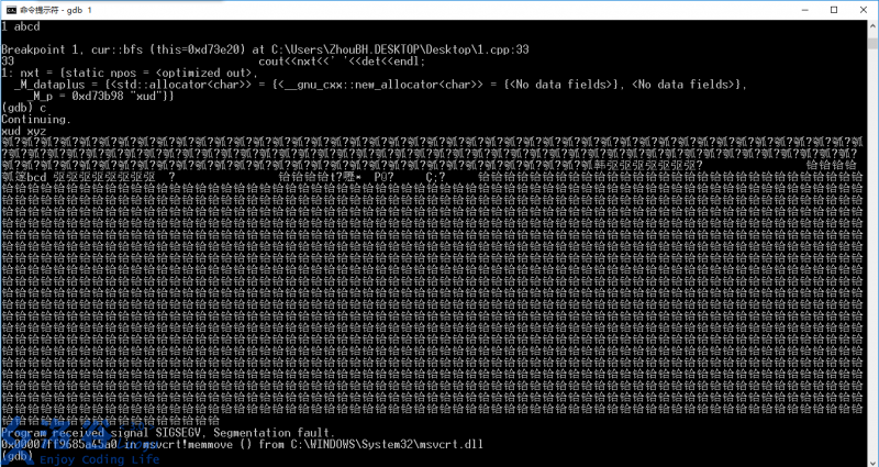 Breakpoint 1, cur::bfs (this=0xd73e20) at C:\Users\ZhouBH.DESKTOP\Desktop\1.cpp:33