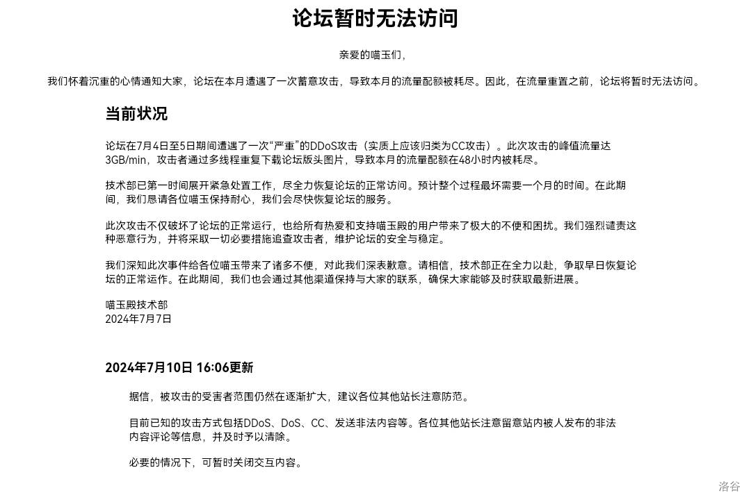 另据喵玉殿技术部公告称,境外网络团体使用了包括但不限于DDoS、DoS、CC、发送非法内容的攻击手段对页面中含有“东方Project”字样的国内网站进行破坏;其次,攻击者有可能将破坏活动进一步延伸至各QQ群及B站直播间等,敬请各位同好留意。