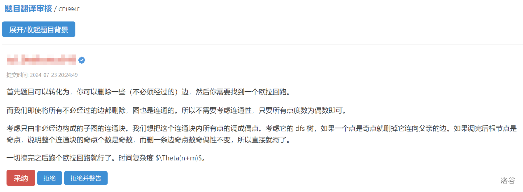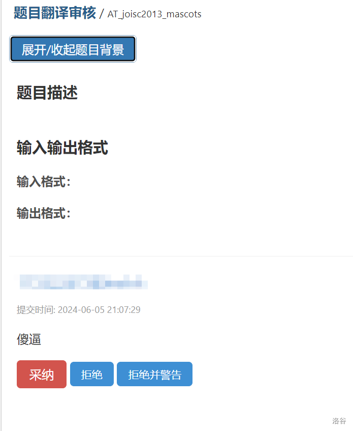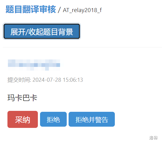这是一个风和日丽,阳光明媚的夜晚,户外刮着 10 级的暴风,雨哗啦啦地下。某只高贵的洛谷管理猿打开了翻译审核页面,惊讶地发现翻译已经两个月没有审核。翻译共有 条,每 条为一页,不审核完当前页的翻译直接审核下一页的翻译不太好。于是它选择直接进行审核: