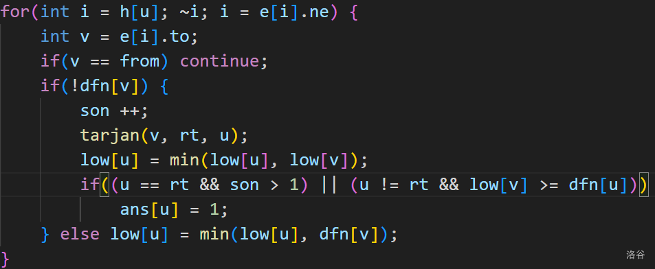 上面第一张图是我在学习强连通分量时的代码,可以看到需要判断 else if(inst[v]) ,而下图是我在学习割点时的代码,可以看到没有加这个判断。