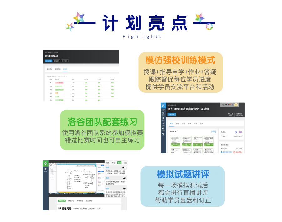 NOIP 计划后期包括集中授课、资料阅读与题单作业布置、定期模拟比赛讲评,从学习过进阶算法开始,达到 NOIP 一等奖较高分的目的。