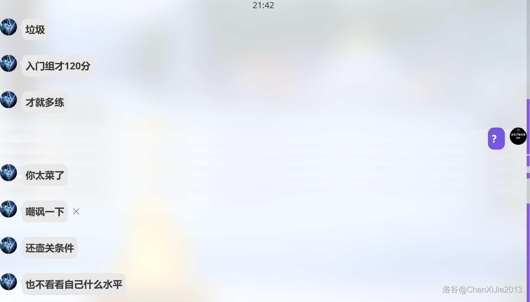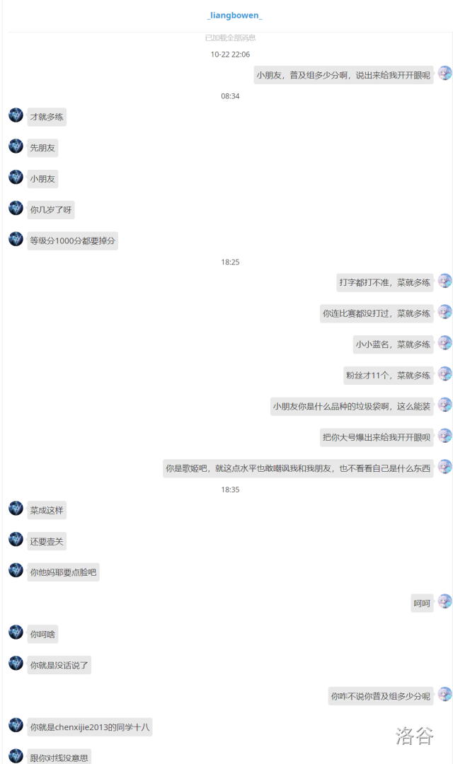 这是我一个谷友:ChenXiJie2013收到的消息。本着有乐子就去围观嘲讽的态度我也是去询问了一下xxs的普及组成绩,然后xxs既不正面回答我的问题还嘲讽了我。。。