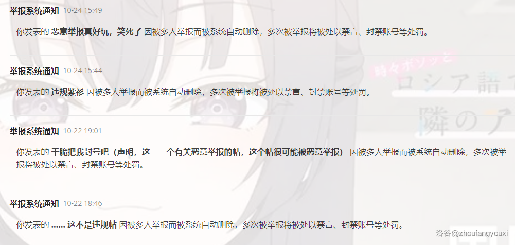 其中 @zhoufangyouxi 谈恶意举报的帖子也被恶意举报而删除了,值得思考