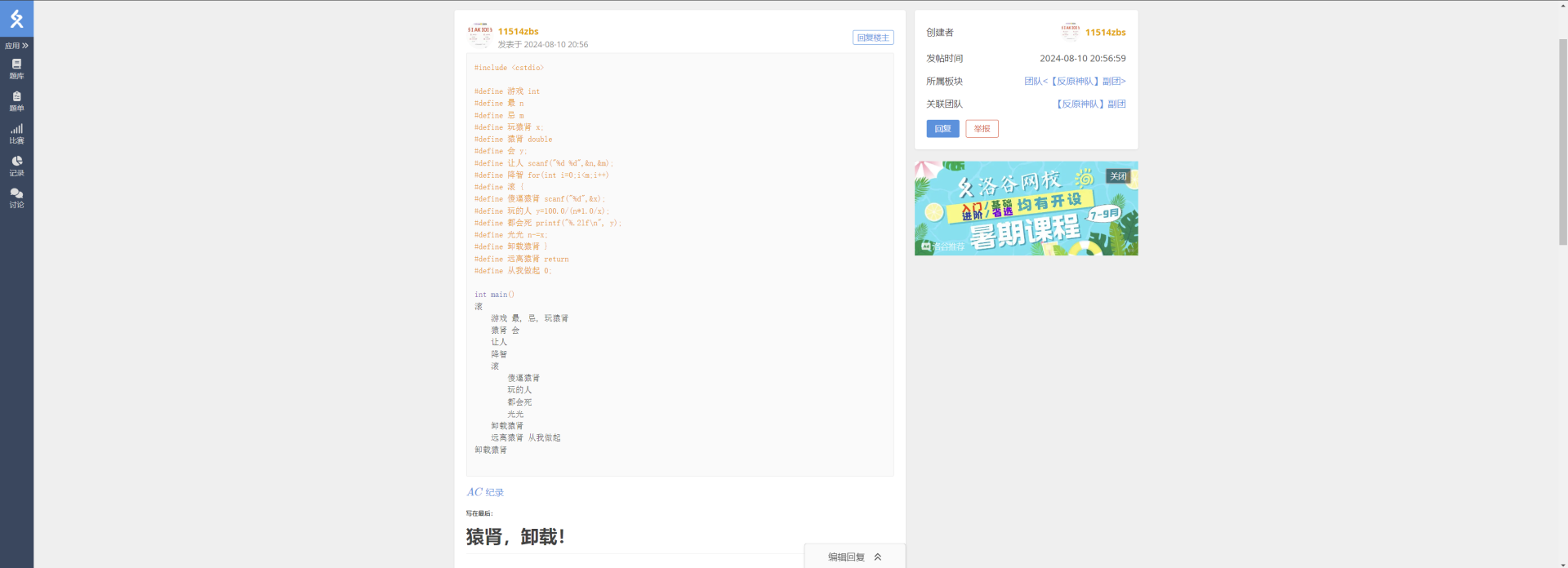在讨论《我还真就不信了这个团神通广大的洛谷管理没法子管》回复: