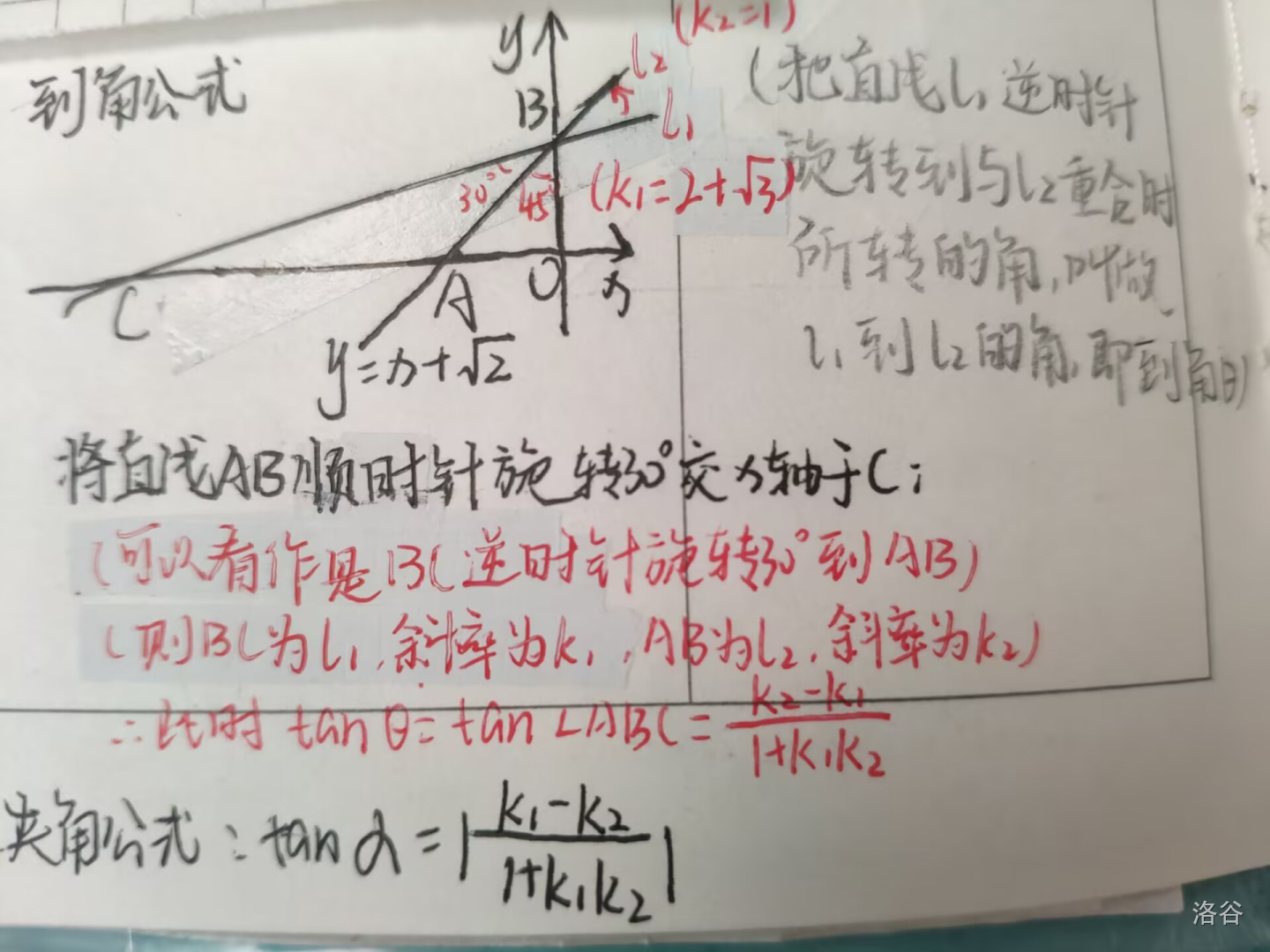 到角公式:若称将直线$l1$逆时针方向旋转,到与$l2$第一次重合时所转的角为 $θ$,则$tanθ=(k2−k1)/(1k1⋅k2)$ 那么这种情况: 把$∠ABC$看作是直线$l1$到$l2…