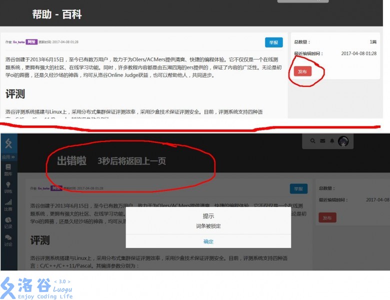 反馈 bug: 在打开被锁定的词条后,点击“发布”按钮,会提示“词条被锁定”,标题变为“出错啦 3秒后将返回上一页” 如下图: