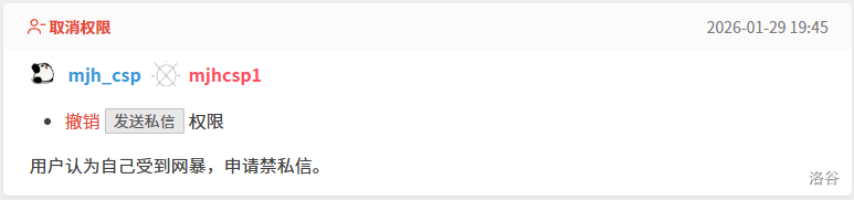 请注意,我只有一个 CSDN 账号,名为 mjhcsp,洛谷只有两个账号 mjhcsp1 和mjh_csp,我已发现了侵权行为,在次不说!!!