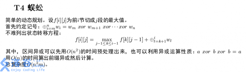 最后一题“数列游戏”为一道动态规划题。 设$f[i][j]$为从第$i$个数到第$j$个数进行游戏的最大得分。初始时若$a[i]$与$a[i+1]$互质,则$f[i][i+1]=0$;否则为$b[i]+b[i+1]$。 考虑转移。 第一种情况,将$i$到$j$分解为两块互不干扰的区间。则 $$f[i][j]=\max_…