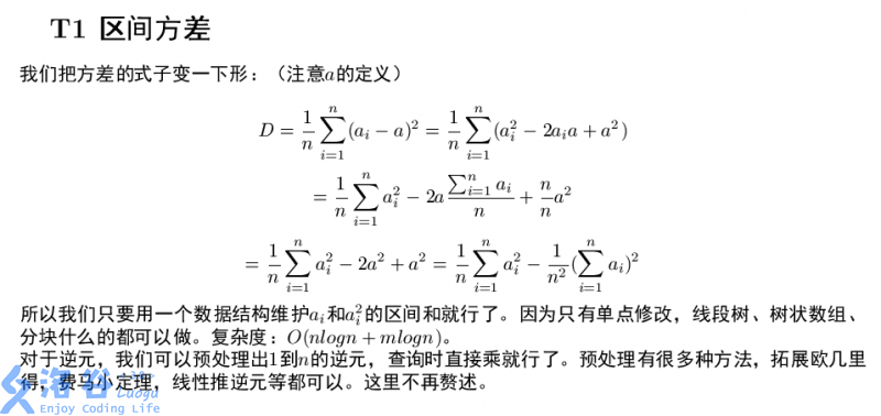 po几个参考程序。可读性超差还请轻喷qwq 区间方差: ```cpp #include typedef long long ll; const int maxn=100005,mod=1e9+7; ll rev[maxn],s[maxn],sq[maxn],num[maxn],y,t,ch; int n,m,c,x,l…