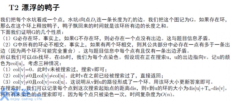 T4漂浮的鸭子是一道图论题。题意是说有若干个点,每个点**有且仅有**一条出边,求最大的环。