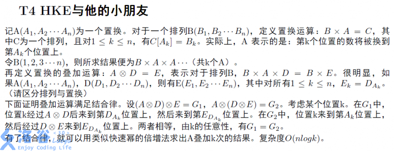 第十题“HKE与他的小朋友”是一道关于轮换的题。 一种做法是用dfs找出循环节,将$m$对循环节取模后暴力移动。时间复杂度$O(n)$。 另一种做法是快速幂。 参考程序: ```cpp #include const int…