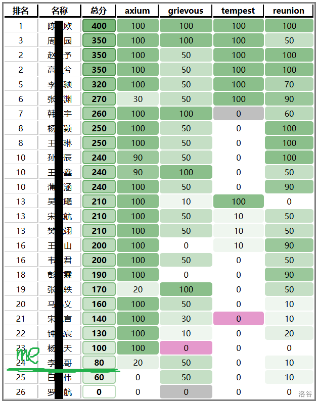 # 「凌云计划」第二场总结 ## 写作原因 无他,just want。 ## 赛事 T1秒了,没毛病啊; T2状态没对、大脑卡壳,没想出正解只写了暴力; 然后就一直死磕T3,没看T4、T5…… 最后交卷后发现文件写错了,一分没得。o(╥﹏╥)o 所以再次金石后人:**检查好文件输入输出** ## T1:village…
