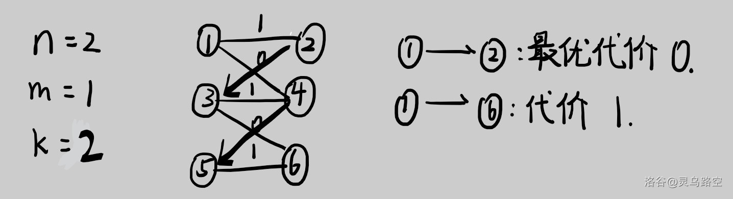 @[xwt1](/user/86711) 上面说的有点问题(( 如果边是有向的会出现起点与最后一层的终点不连通的情况。 此题边是无向的,会出现起点到最后一层终点的代价并不一定是最小的情况。下图是一个简单的例子:  若 $m<k$ 时,可能会出现起点无法到达最后一层图的情况。具体情况您可以画张图感受一下。