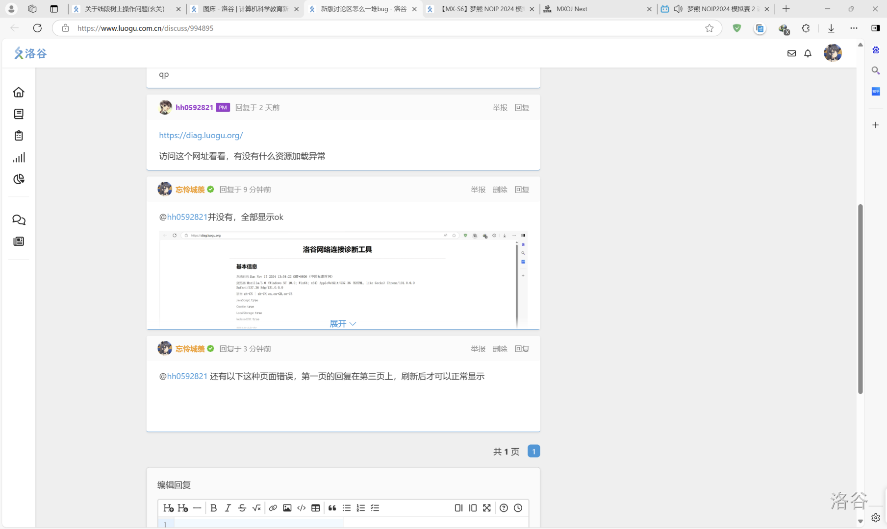 @[hh0592821](luogu://user/96686) 还有以下这种页面错误,第一页的回复在第三页上,刷新后才可以正常显示 ) 并没有,全部显示ok