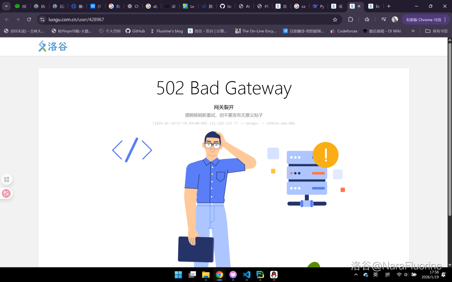@[kobelukuankuan](luogu://user/1124371) 刚才爬到这里的时候直接15s超时给我爬虫干爆了,然后我浏览器访问返回502网关裂开,我问另一个同学也是进不去这个网页. 怎么现在就可以了呢?好神秘
