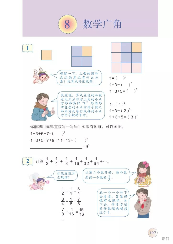 107页说,**加下去,等号右边的数越来越接近1。** 但是加下去,好像永远不能等于1,但是课本108页的算式上写的又是 **=1**? *** 本蒟蒻琢磨了好长时间,求助各位大佬,谢谢了