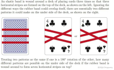 @[AstaSunch_](/user/764773) 将一根弹性带绕一副扑克牌三次,以便在牌牌的顶部形成三条水平条 纹,如左图所示。忽略了橡胶带自身的不同重叠方式,在甲板的下侧 基本上可以形成两种不同的图案,如右图所示。 4 4 或 如果两个图案是180°旋转的,那么如果橡胶带缠绕在上面形成七条水平条纹 那么在甲板的…