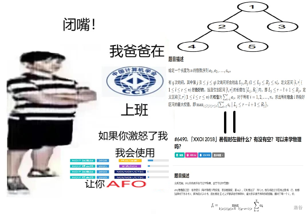 省流:自己写的时候都没绷住。 --- "妈!这道 [tree](https://www.luogu.com.cn/problem/P14637) 我卡了 $100$ 天!"书房里传来摔笔的声音,客厅中的母亲攥紧了手机——屏幕上正显示着家长群热议:"隔壁 @[shuqiang](https://www.luogu.com…
