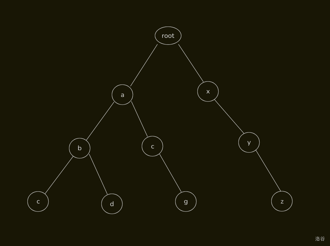 # 字典树 先举例子画一棵字典树: 将 $abc,abd,acg,xyz$ 加入到一棵字典树中则:
