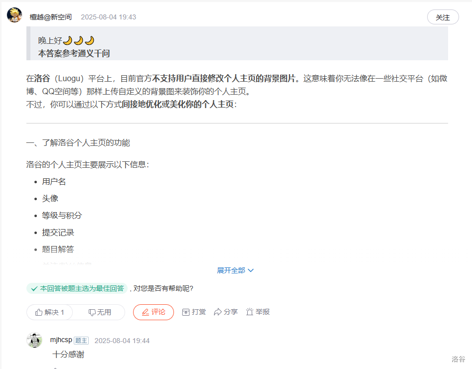 @[mjhcsp1](luogu://user/1814180) 你在你们班值日生用 $0.5\sim1\operatorname h$ 的时间拖完地之后会上去踩两脚吗? 事实上,你抄袭他人的文章,就和上面我举的例子相近,都是**不尊重他人劳动成果的行为**。我,当然肯定包括大多数洛谷用户,很反感你这种行为。
