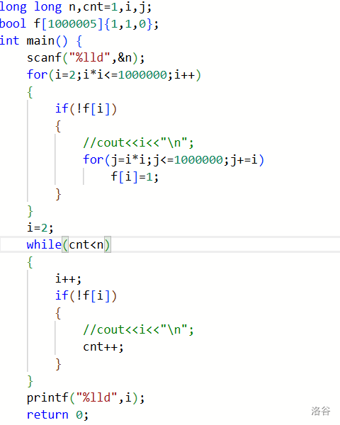 ```cpp #include using namespace std; long long n,cnt=1,i,j; bool f[1000005]{1,1,0}; int main() { scanf("%lld",&n); for(i=2;i*i<=1000000;i++) { if(!f[i]) { //cou…