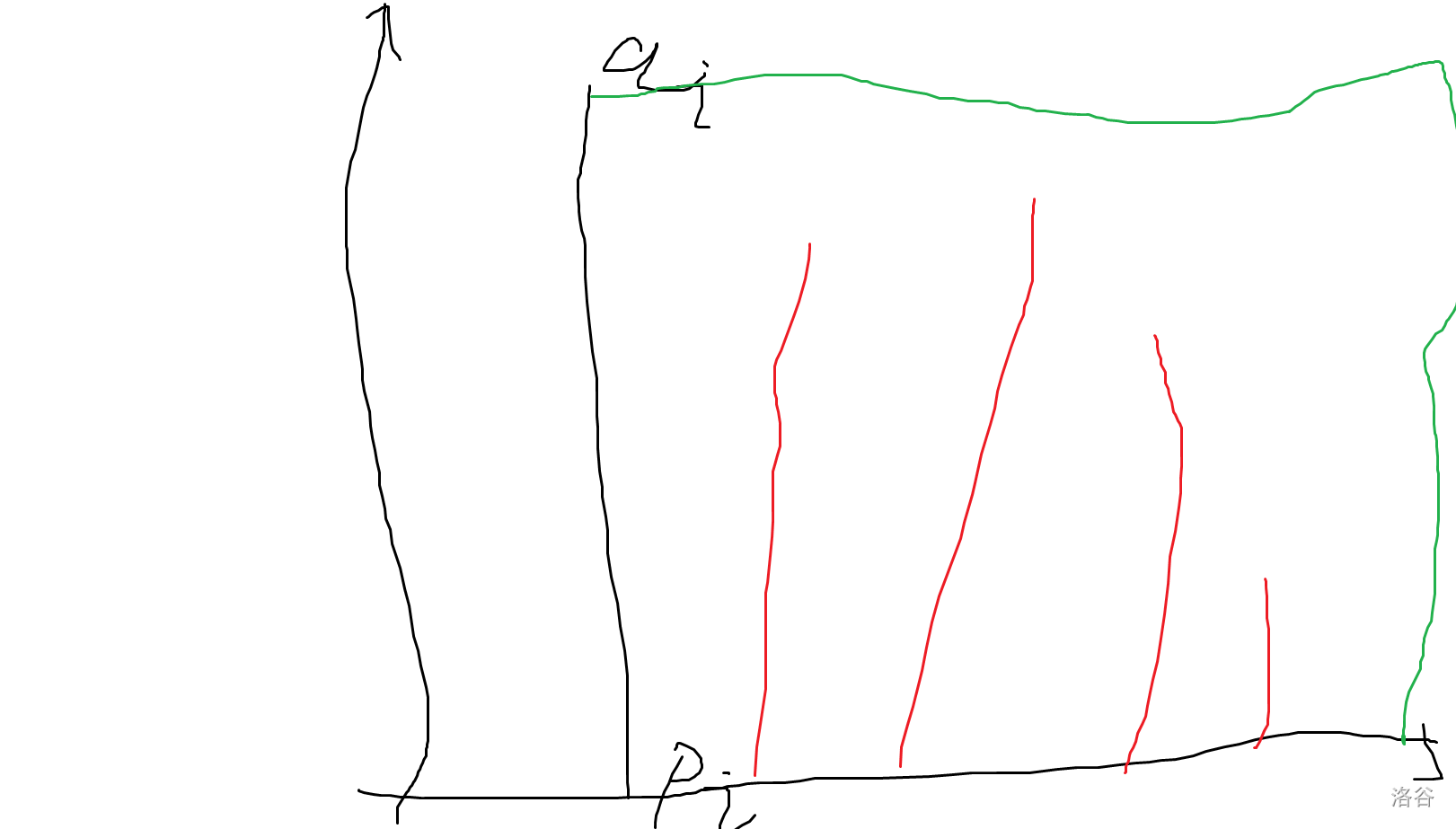 我自己想了一个思路,但是样例三$WA$了 就是这样一个东西 其中中间黑线和绿色线围成的,高度不超过上面绿线的红线是对答案有贡献的 代码如下: ```cpp #include #include #…